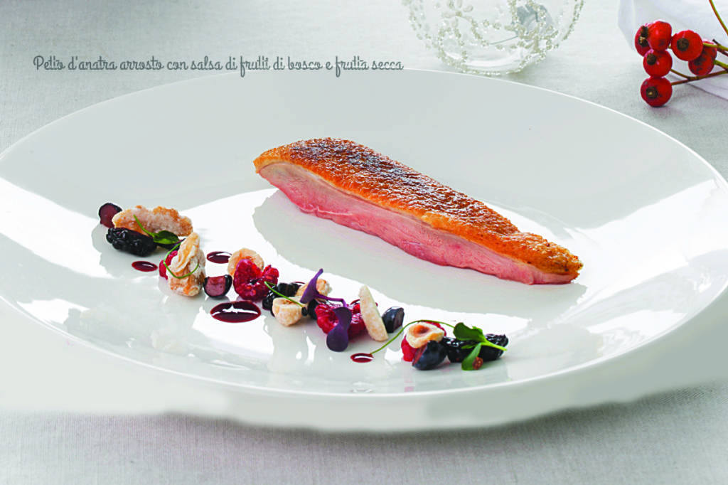PETTO D’ANATRA ARROSTO CON SALSA DI FRUTTI DI BOSCO E FRUTTA SECCA