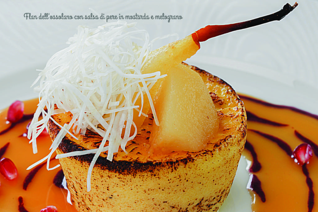 FLAN DELL’OSSOLANO CON SALSA DI PERE IN MOSTARDA E MELOGRANO