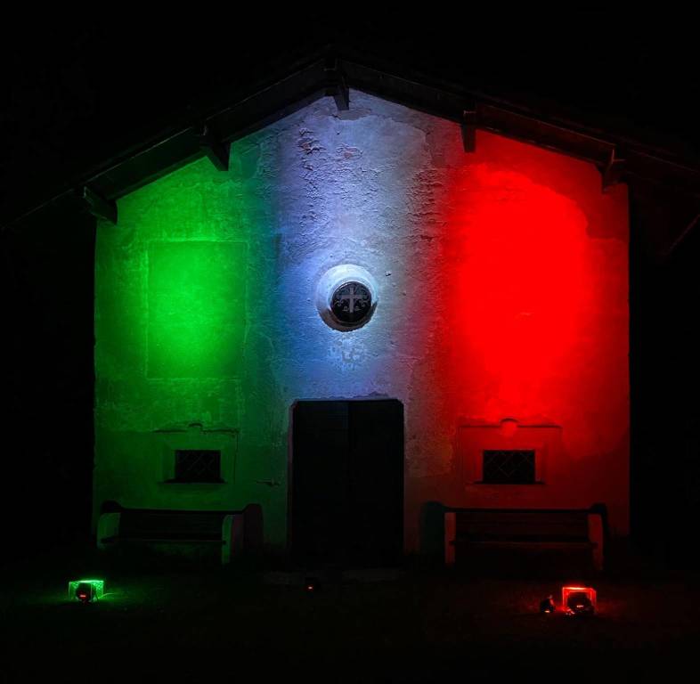 Ieri sera infatti, grazie all’omaggio della Pro-One Service, la chiesetta sconsacrata di San Vincenzo e il volto del palazzo municipale e si sono tinti con le luci e i colori della bandiera italiana, verde bianco rosso, per dare un segnale, un simbolo di unione a tutti i suoi cittadini.