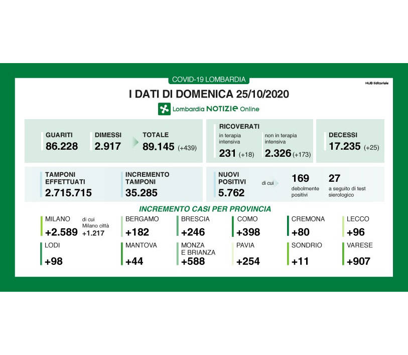 La Lombardia detiene ancora il triste primato di maggiori contagi con 5.762 nuovi positivi con 32mila tamponi effettuati, per una percentuale pari al 16,3%.