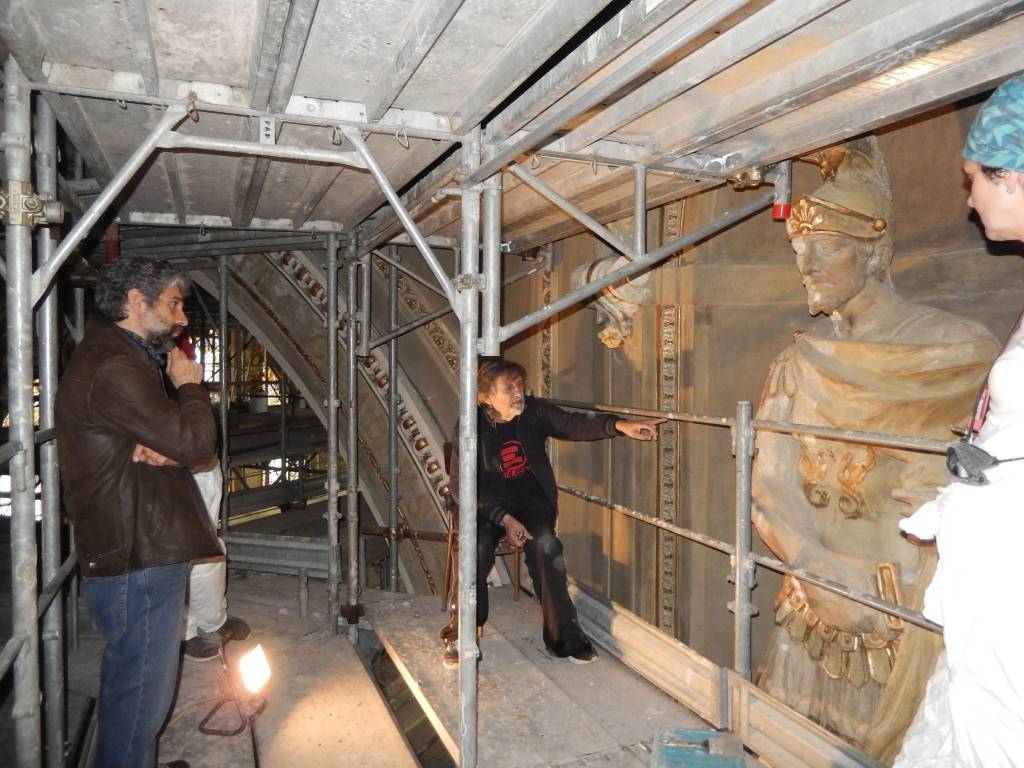 Le superfici decorate di una buona parte della volta centrale sono state sottoposte a una ricognizione mediante l’utilizzo di una piattaforma elevatrice, in modo da verificare le zone in fase di distacco e “toccare con mano” i problemi in quota, che non è possibile apprezzare dal basso a occhio nudo. Si è anche installata una rete di protezione per prevenire i danni derivanti dalla possibile caduta di altri frammenti di intonaco dalla volta della navata. In particolare vi è la zona in corrispondenza del soprastante abbaino, che da accesso alle coperture dal sottotetto, interessata da infiltrazioni di acque meteoriche, che potrebbero generare altri problemi. Il progetto generale di restauro, approvato dalla Soprintendenza, prevede il ripristino di tutte le coperture della chiesa, eliminando il manto sotto coppo in fibro-cemento, che contiene eternit e rinforzando le strutture lignee che si presentano parecchio ammalorate e “pasticciate” da diversi interventi di manutenzione che si sono succeduti nel tempo. Contemporaneamente si interverrà sulle centine lignee della volta della navata centrale, che non è in muratura portante ma è, di fatto, un controsoffitto voltato, appeso alle strutture lignee del tetto».