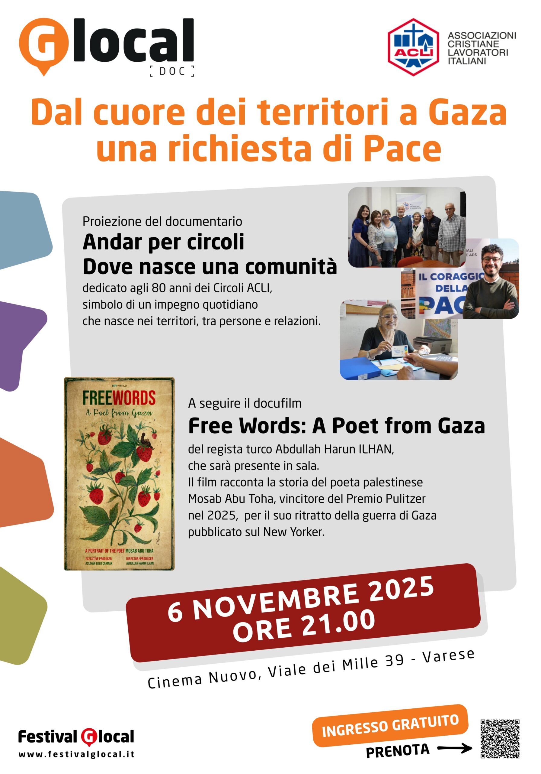 Un filo di pace che unisce Varese a Gaza. È questo il cuore della serata finale di Glocal DOC 2025, in programma giovedì 6 novembre alle 21.00 al Cinema Nuovo di Varese, con ingresso gratuito e prenotazione consigliata. L’evento concluderà la terza edizione del festival dedicato al cinema del reale, con la premiazione dei vincitori del concorso Glocal DOC e del Premio Agostini, selezionati tra oltre mille opere arrivate da tutto il mondo.
