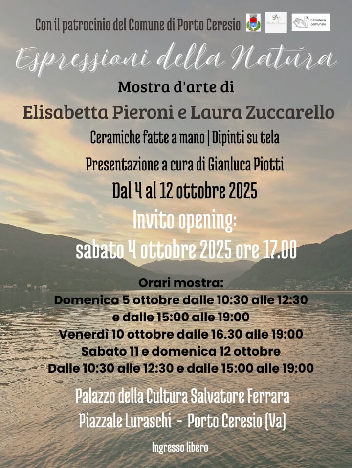 Un viaggio tra arte, natura e materia prende vita a Palazzo della Cultura Salvatore Ferrara con la mostra “Espressioni della Natura”, che inaugurerà sabato 4 ottobre alle ore 17.00 con la presenza delle due artiste protagoniste: Elisabetta Pieroni e Laura Zuccarello. L’esposizione, organizzata da Federica Gentile, presidente della Commissione Biblioteca di Porto Ceresio, offre al pubblico un dialogo tra materiali, tecniche e visioni creative dedicate al mondo naturale.